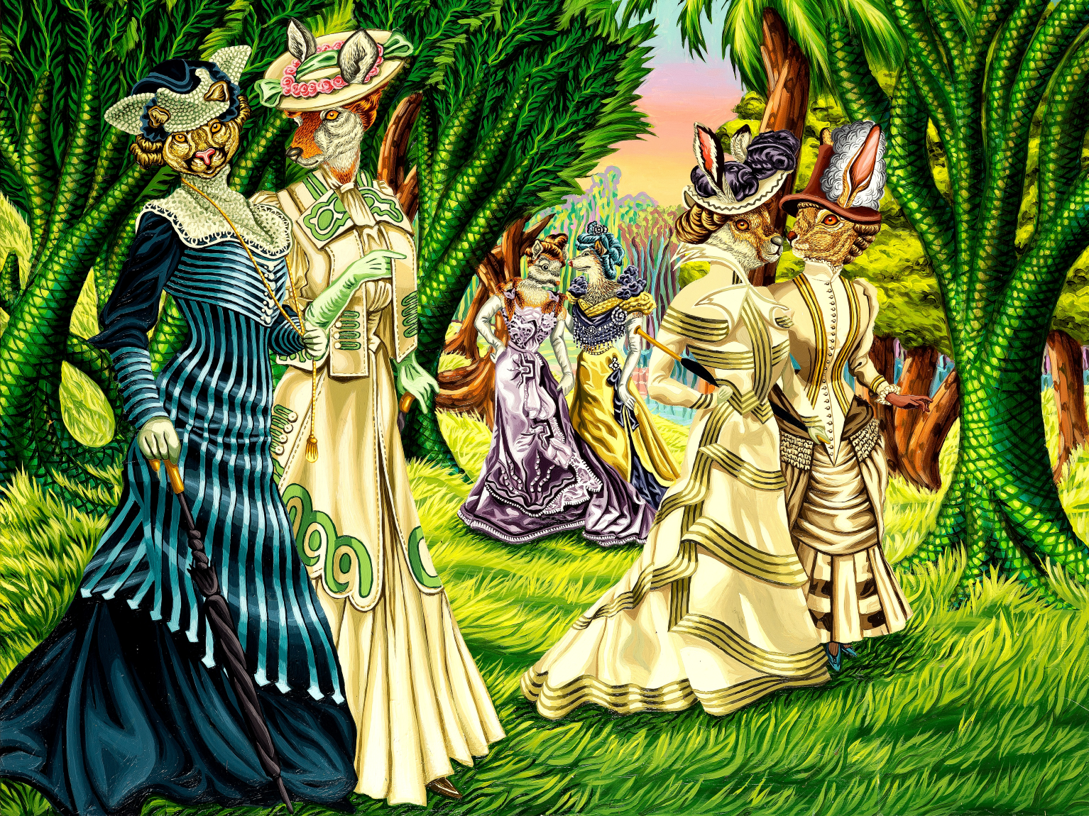 Vanity Fauna es un viaje a un territorio habitado por animalas, hembras no humanas, con cabezas de diferentes especies salvajes y cuerpos antropomorfos, aristócratas vestidas con trajes largos de la época victoriana, costosos, complejos y encorsetados; usan sombreros con plumas, peinados con moños, joyas y guantes, posando para las y los espectadores. Aluden a un período en el que las mujeres debían camuflar la carencia de voz propia y derechos con elegancia y ornamentos inspirados en la naturaleza.