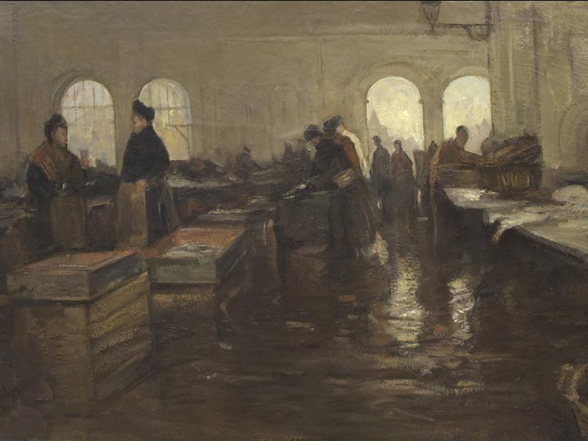 A. F. Reicher. Mercado de pescado. Óleo sobre tela, 63,5 cm x 100 cm. Surdoc 2-2020. Museo Nacional de Bellas Artes. Fotografía: Eloísa Ide.