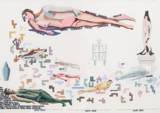 En esta muestra el autor presenta una serie de bordados, con los que rompe las convenciones en torno a la práctica artística y a la noción de género, dando cuenta de su relación con nuestro país y su vivencia en torno a la violación de los Derechos Humanos. A modo de un diario hecho a la distancia, Arias compila en sus lienzos los hechos asociados a la violación de los derechos humanos que lo marcaron tras el golpe militar de 1973, así como el cambio cultural que siguió al advenimiento de la democracia.